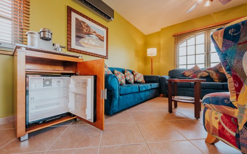 On the second floor, you'll discover the colorful master bedroom with a generous walk-in closet and an ensuite bathroom. Adjacent to the master bedroom, there's a furnished office space featuring a mini refrigerator. Connected to this office space is another living area, complete with a pull-out sofa bed, a 65″ flat-screen TV, and a balcony furnished with a table and chairs.